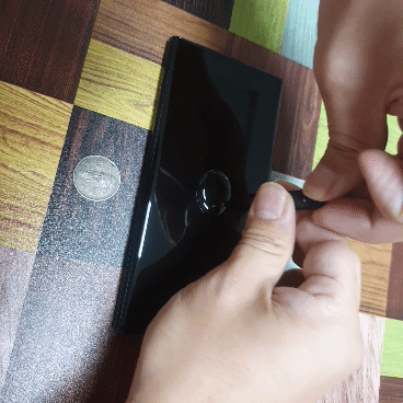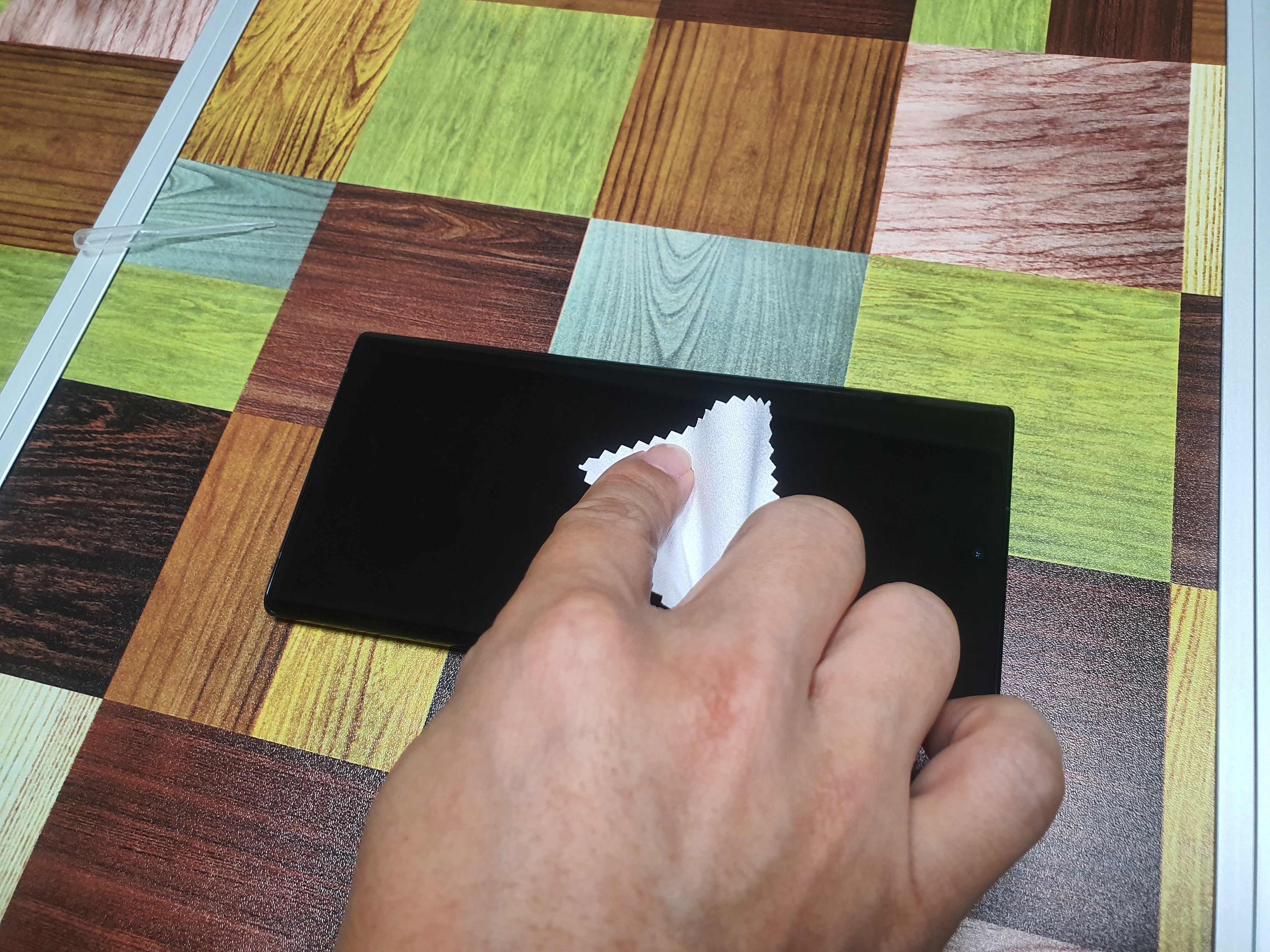 7. 강화유리의 접착면 보호필름을 제거하고 천천히 강화유리 내려놓기 (강화유리 누르기 금지)