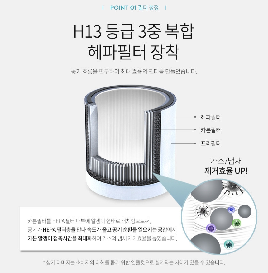 H13등급 헤파필터 + 카본필터 + 프리필터의 3중필터 장착