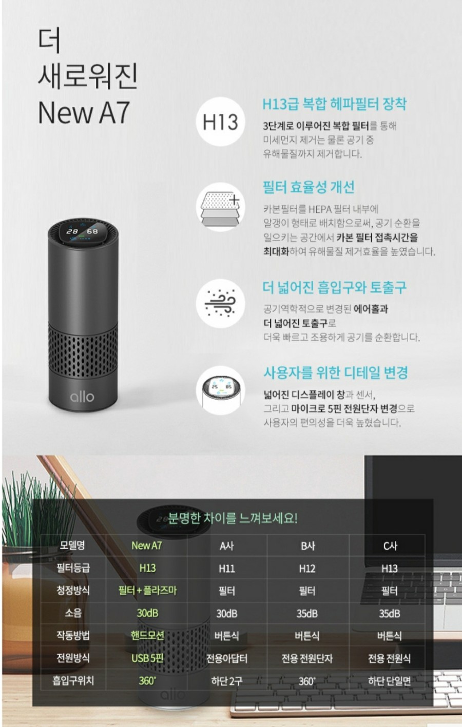 오염물질을 막아주는 H13 고성능 헤파필터와 오염물질을 제거해주는 플라즈마 이오나이저 방식을 모두 적용한 알로 휴대용 공기청정기 NEW A7