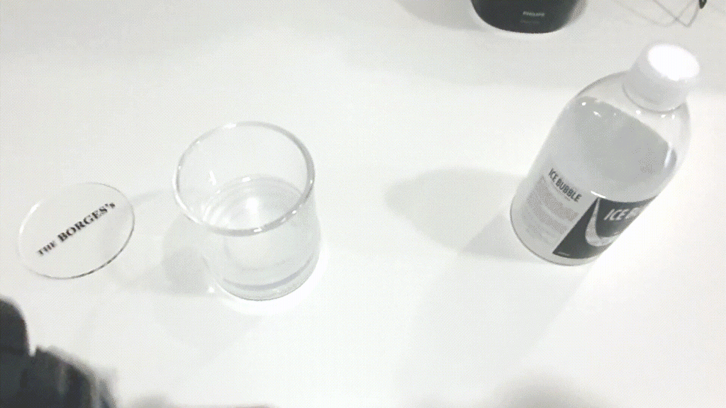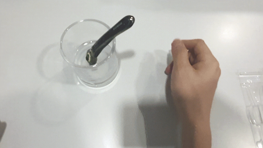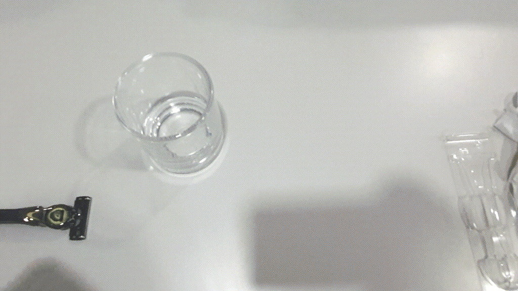 유리컵에서 면도기를 청소하는 영상입니다.