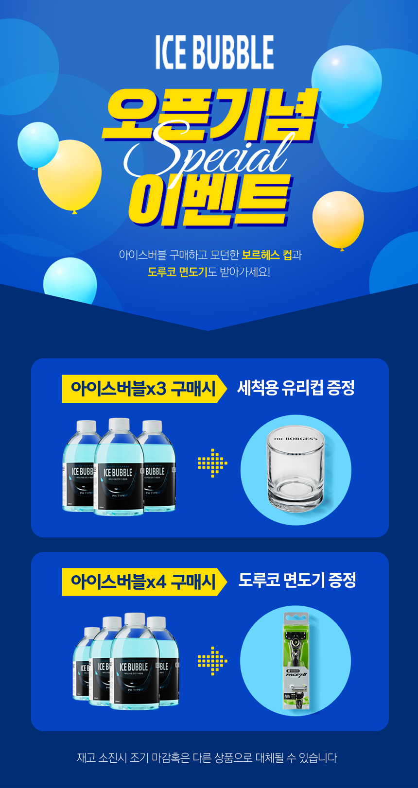 오픈 기념 이벤트로 구매 수량에 따라 세척용 유리컵과 도루코 면도기를 증정하고 있습니다.