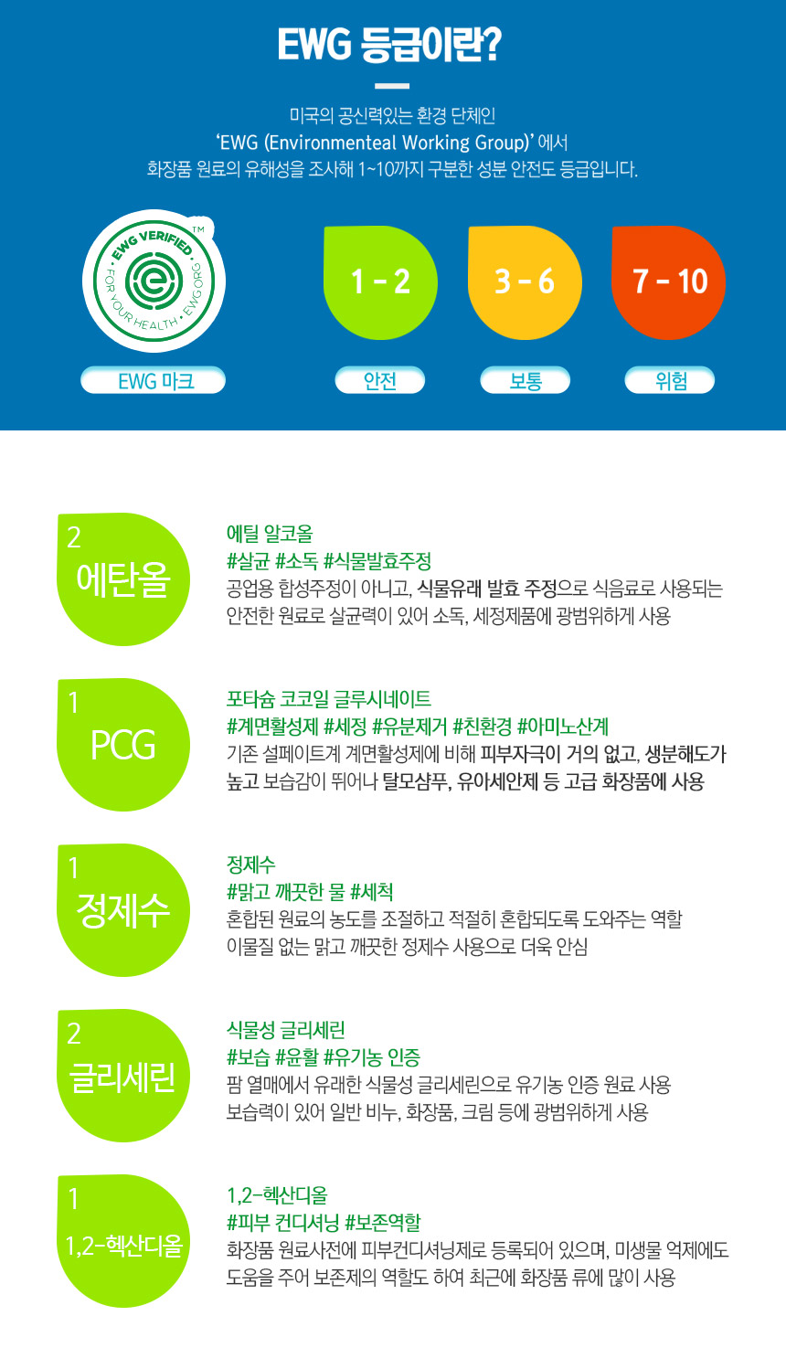 EWG 그린 등급을 받은 핵심원료를 사용한다고 합니다. 모든 것이 녹색불이 켜져 있네요. ^^