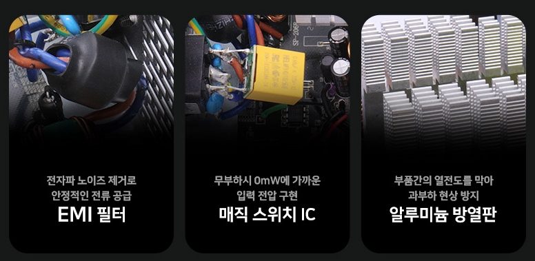 EMI 노이즈 필터 적용으로 교류(AC)가 직류(DC)로 변환되는 과정에서 만들어지는 전기적 노이즈인 리플 노이즈(Ripple & Noise)를 제거하고, 매직 스위칭 트랜스 방식 적용으로 부하가 없을 때는 0mW에 가까운 전압조절이 가능하며, 듀얼 알루미늄 히트싱크 블럭을 적용하여 내부 발열을 최소화시켰습니다.