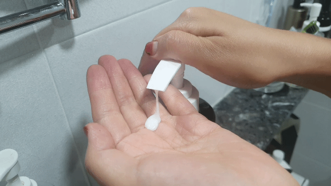 쫀쫀한 점성에 하얀색 제형의 샴푸입니다.