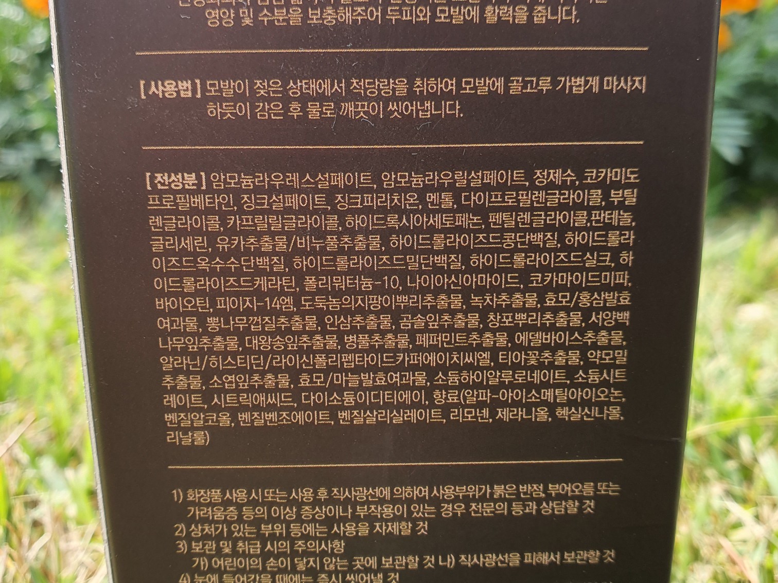 탈모 증상 완화에 도움을 주는 4가지 주요 성분인 비오틴, L-멘톨, 징크피리치온, 나이아신아마이드가 함유되어 있고, 천연성분 보리 뽕나무 티아꽃 마늘효모 인삼 등의 추출물들이 함유되어 모발과 두피에 정말 좋은 성분들이 영양을 공급해 줘요.