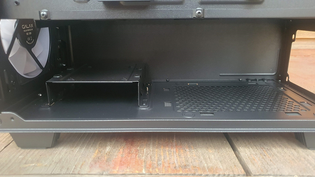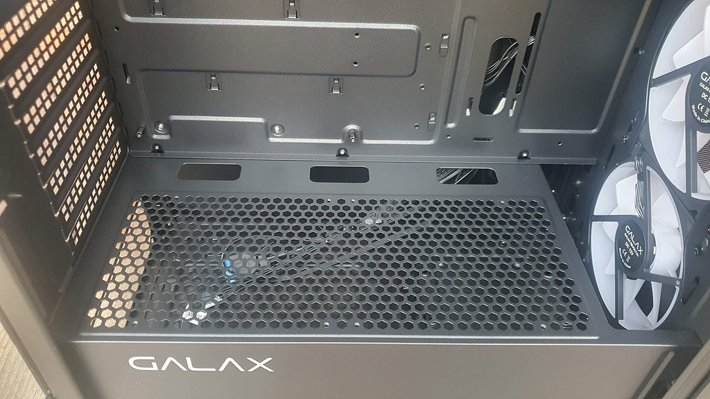 파워서플라이 체임버 상단은 에어홀이 잘 뚫려 있고 120mm 쿨링팬 2개를 장착할 수 있도록 나사 구멍도 제공합니다.