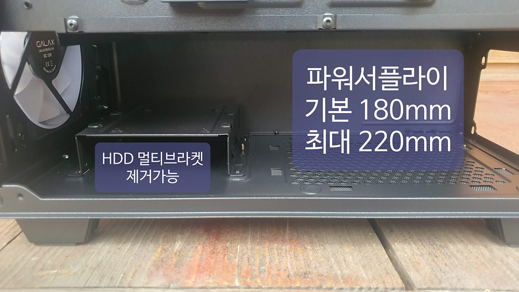 파워서플라이 장착부는 기본 180mm이며 옆의 공간까지 최대 220mm입니다. 하드디스크 베이를 제거한다면 더 넓게 사용이 가능해 사용의 편의성이 돋보입니다.