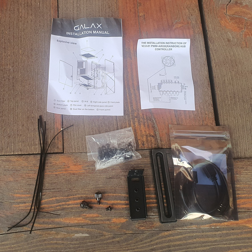 케이스 설명서, 허브 연결 설명서, 케이블 타이, 각종 나사, 그래픽카드 지지대, ARGB 연동 케이블