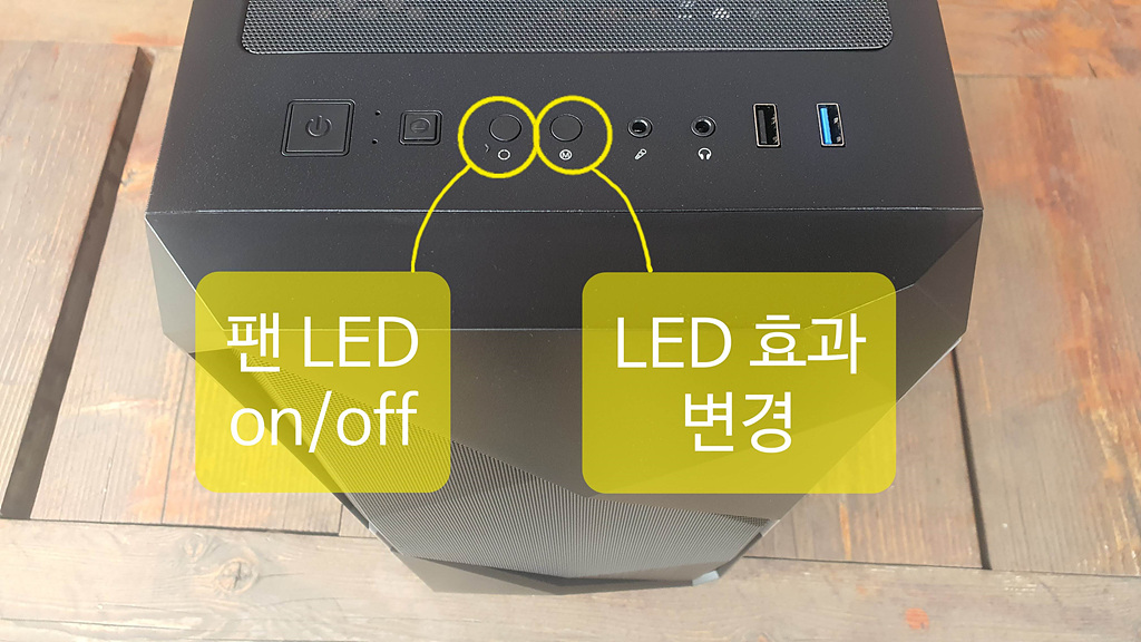 전면 상단 I/O 인터페이스에 FAN LED 전원 On / Off 버튼과 LED 효과 변경 컨트롤 버튼이 있습니다.