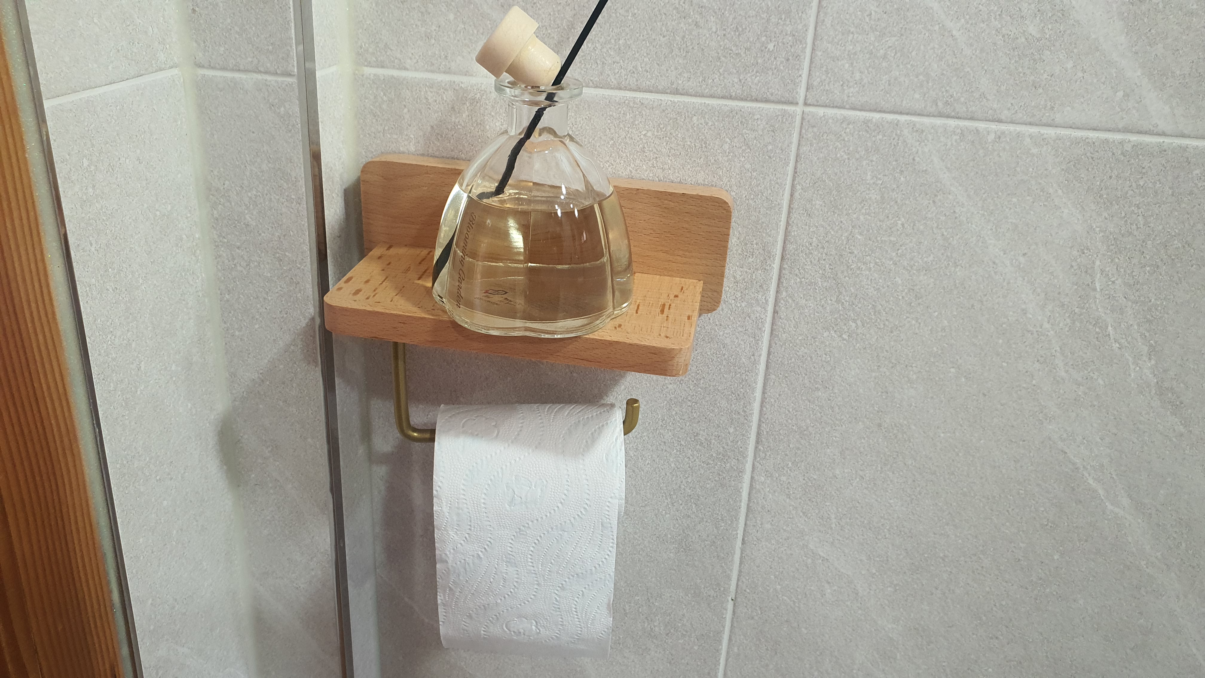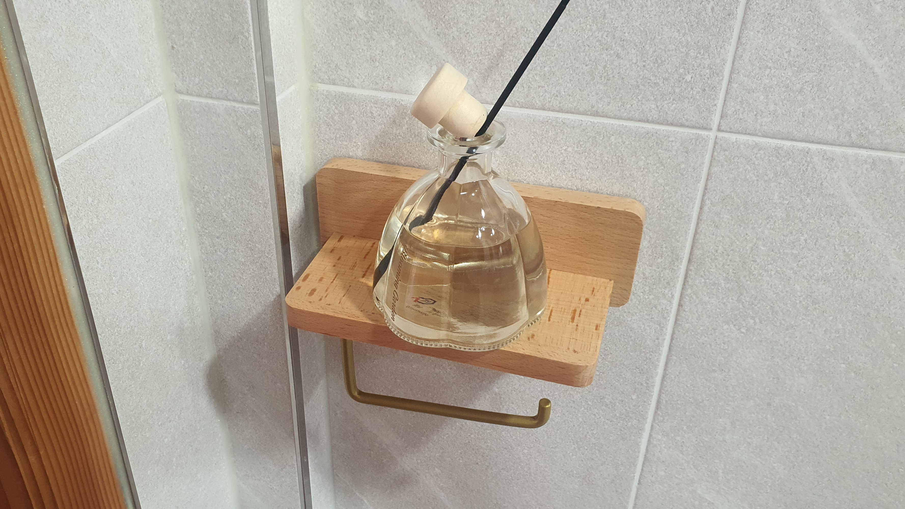 이제 휴지를 사용하기 좋은 각도에 원목의 느낌을 잘 살린 선반형 휴지걸이가 화장실의 품격을 살려주네요! ㅋㅋ