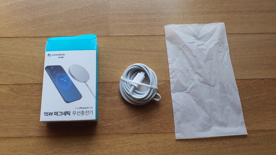 박스 안에 무선 충전 패드와 연결선을 고무줄로 잘 고정시켜두었습니다.