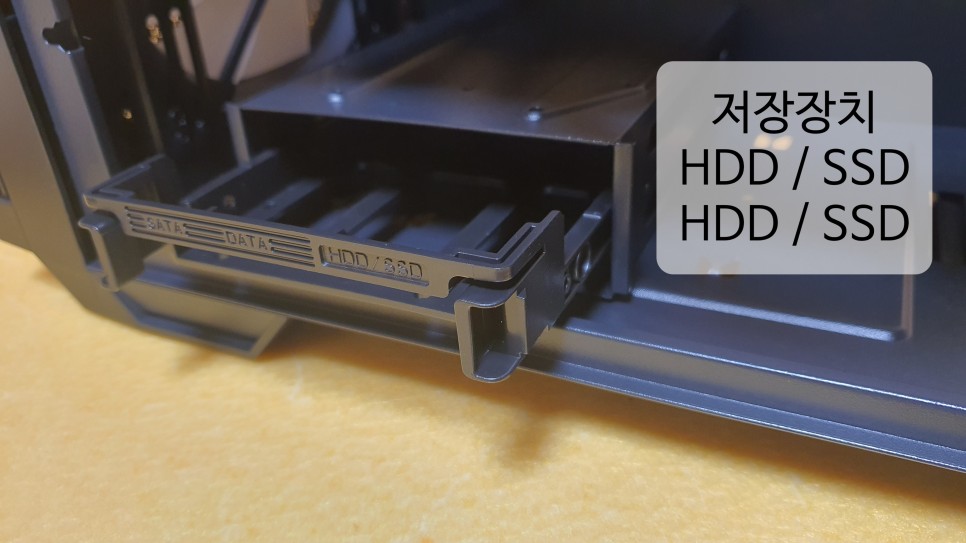 스토리지는 브래킷을 제공하며 3.5인치 HDD 2개 + 2.5인치 SSD 2개 & SSD 4개 중에 선택하여 총 4개의 스토리지 장착이 가능합니다.