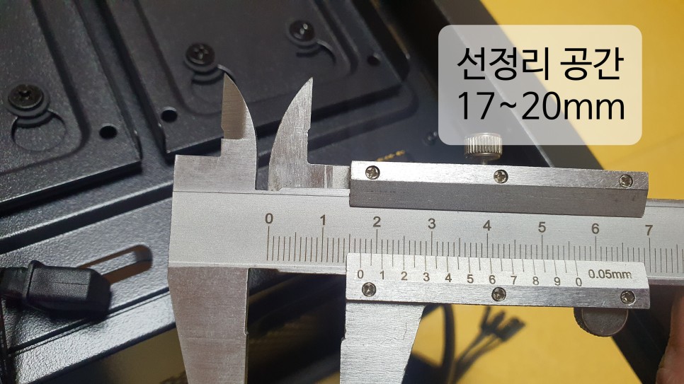 선 정리 공간은 약 17~20mm로 실제 조립을 해보면 측면 들어간 공간들이 많아서 쉽게 선 정리가 가능합니다.
