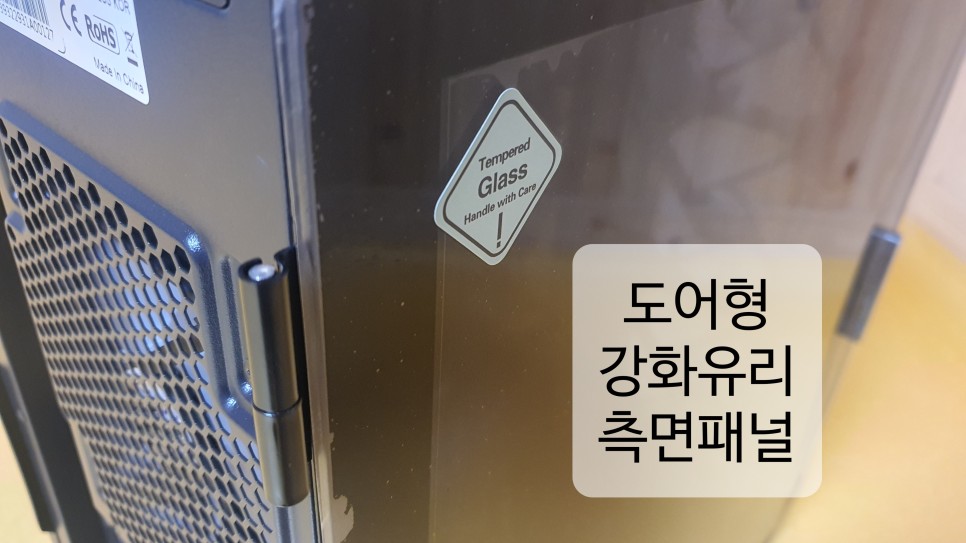 좌측 메인 패널은 4mm 강화유리 흰지타입 스윙 도어를 적용하였고, 반대편인 우측면은 평범한 강판에 손나사 고정 볼트 형식입니다.