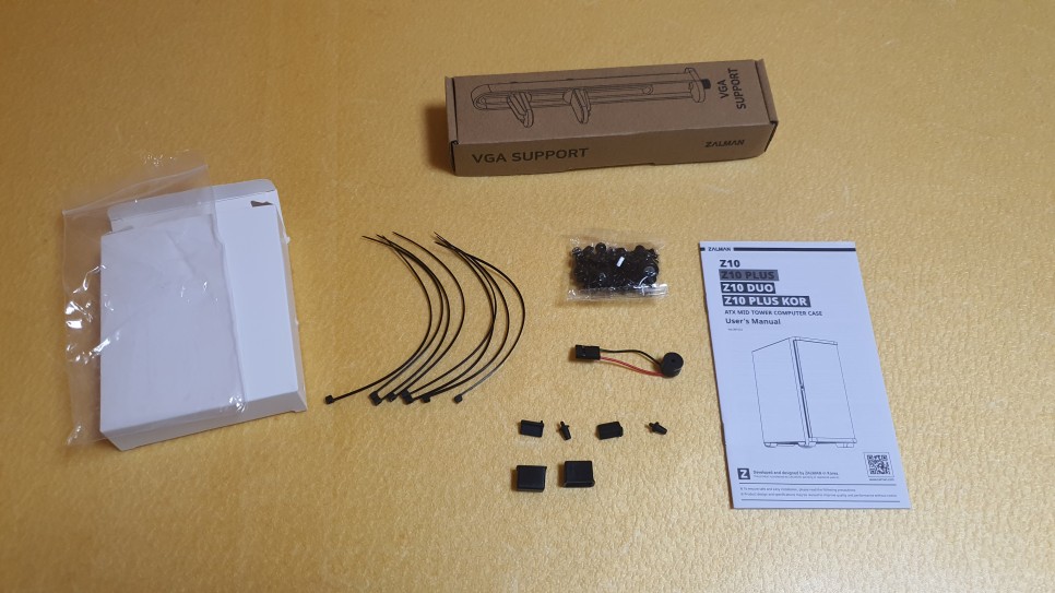 케이스 설명서, 케이블 타이, IO 포트 캡, 각종 나사, 메인보드 스피커, 그래픽카드 지지대