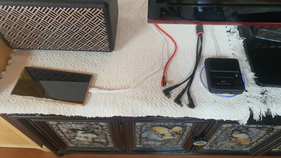 갤럭시 노트 10플러스에 35w 초고속 충전을 연결하고 갤럭시 플립에 일반 10w 충전을 연결해 보았습니다.
