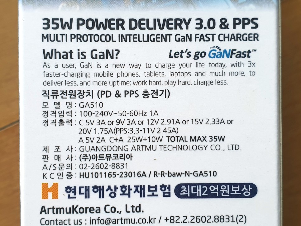 아트뮤 GA510 고속 충전기는 재부팅 없는 듀얼 충전 포트에 최대 35W 충전 & 25W+10W 동시 충전을 지원하고, 삼성 25W 초고속 충전을 지원합니다. 현대해상 최대 2억 원 보상 보험에도 가입되어 있네요!
