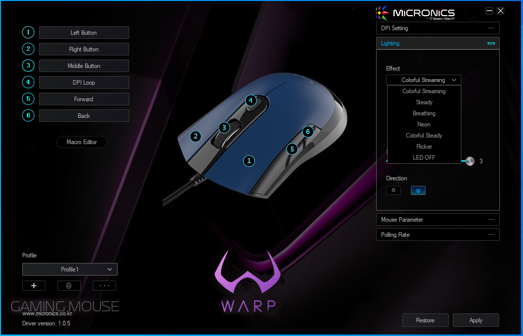 마이크로닉스 게이밍 기어 WARP 라인업 중 하나인 유선 게이밍 마우스입니다.