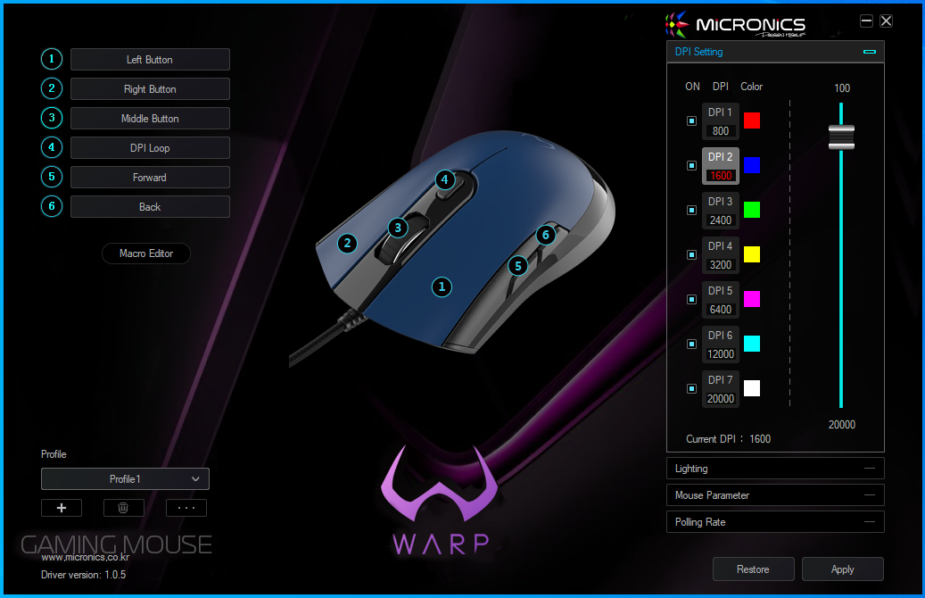 DPI는 100부터 20,000까지 100단위로 설정할 수 있고, DPI 단계별로 조명 색도 변경이 가능하네요!