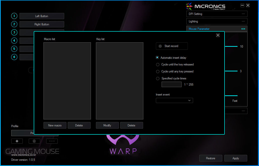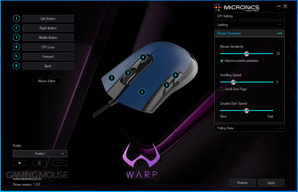 기능은 키 매핑, 매크로 설정, 3개의 기본 프로파일 설정, DPI 설정, LED 설정, 마우스 기본 설정, 폴링레이트 설정이 가능합니다.