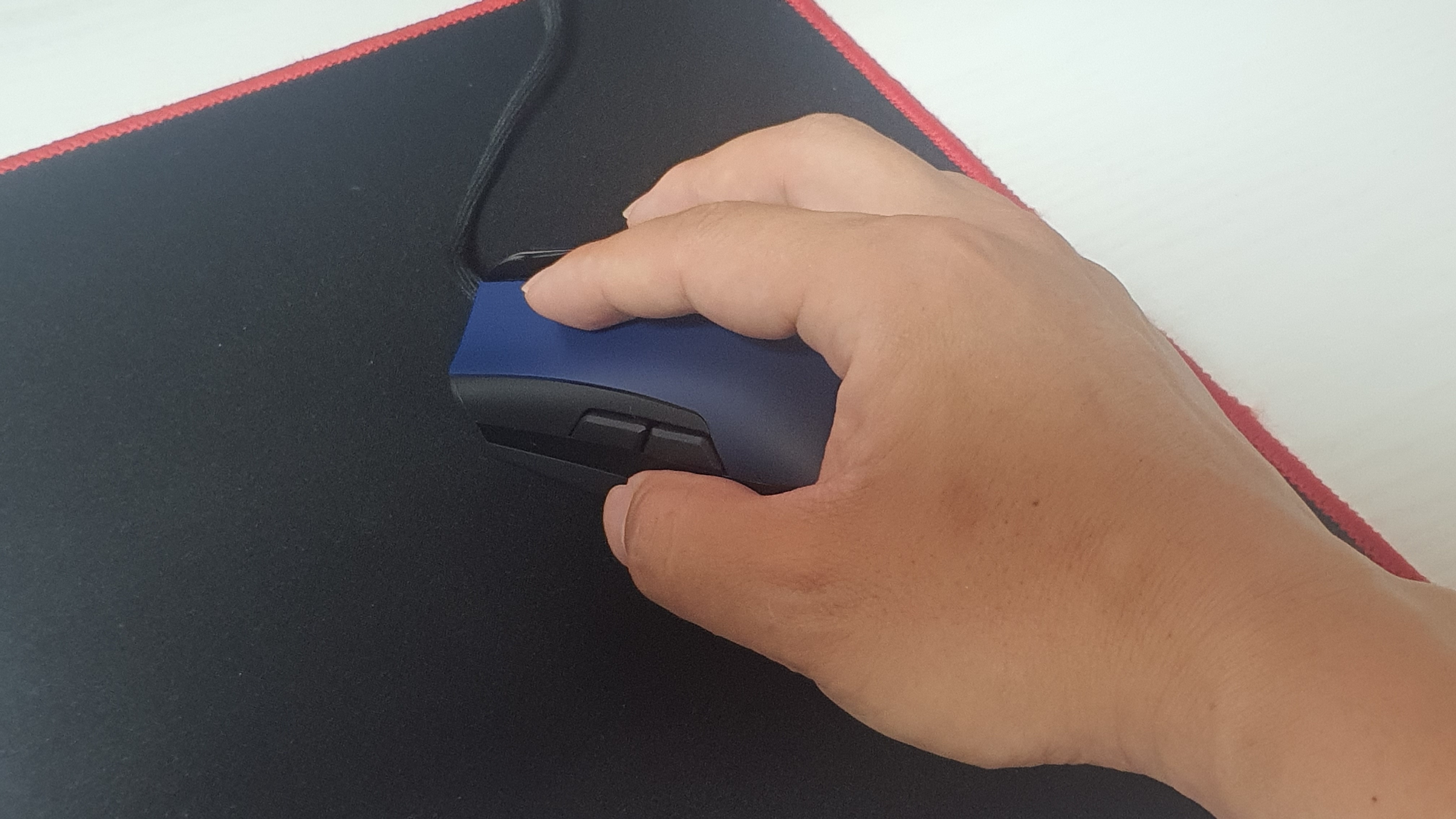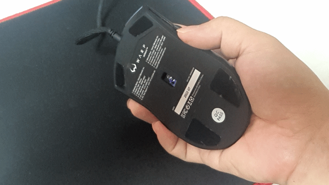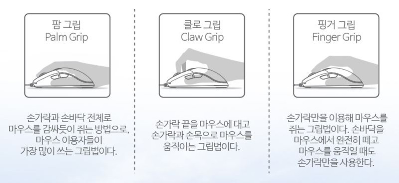 일반적인 마우스 크기로 사람들이 가장 많이 쓰는 그립법으로 핑거 그립이 잘 어울리는 형태 같습니다. 물론 팜, 클로 그립도 사용하기 좋은 디자인입니다.