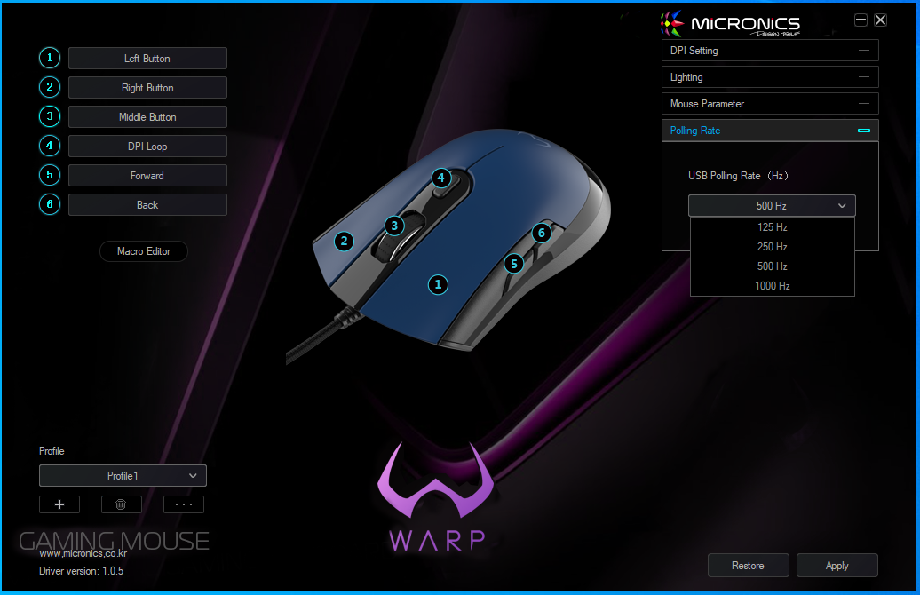Polling Rate에서는 폴링 레이트를 4가지 감도로 설정이 가능합니다. 기본값 500Hz (125, 250, 500, 100)
