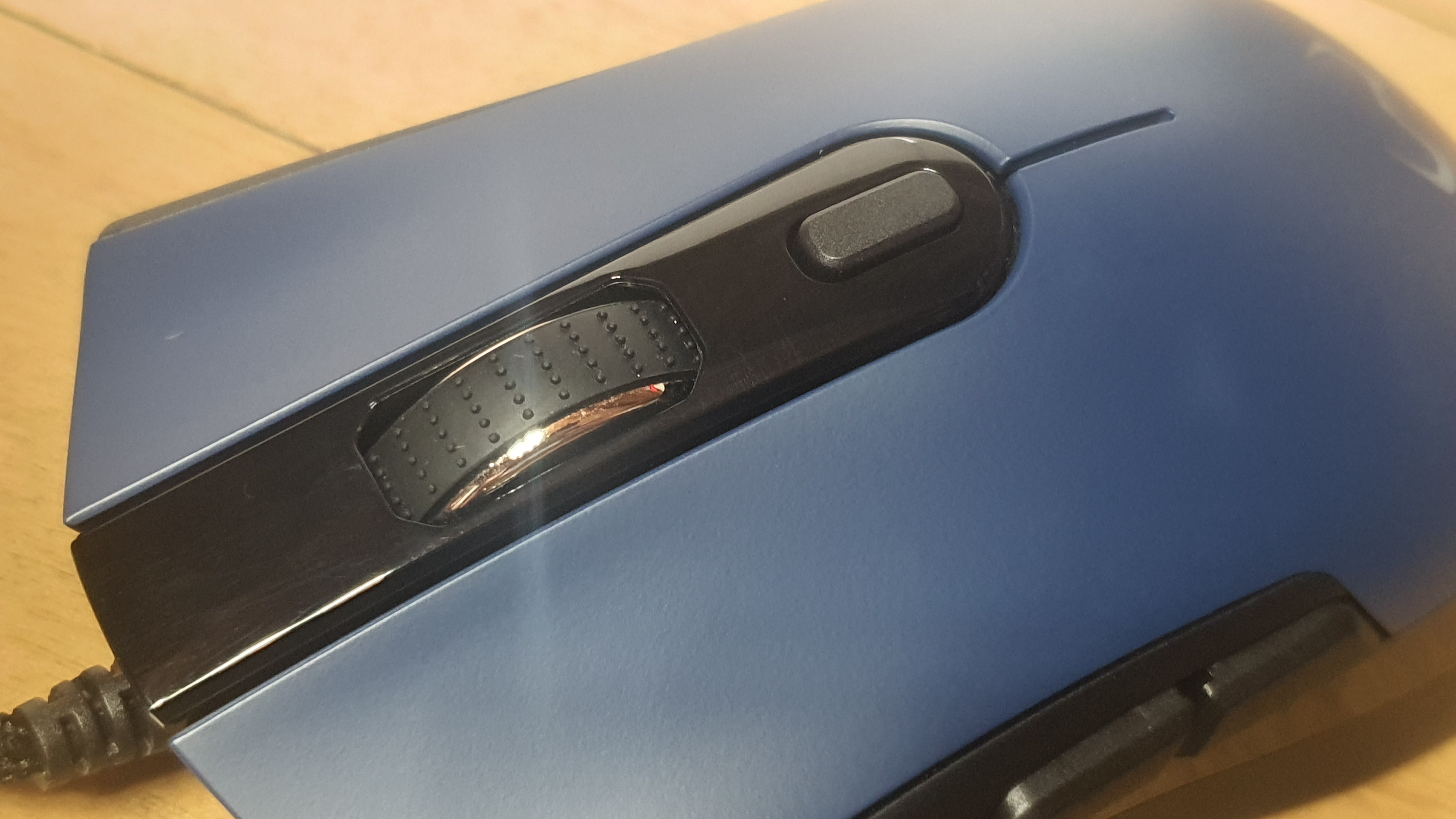 마우스 상단에는 고무벨트를 사용해 그립감 좋고 미세한 돌기가 있어 미끌림 없는 휠 버튼이 있고, 후아노 블루쉘 화이트 버튼보다 압력이 높은 느낌의 그린 스위치를 사용하였습니다.
