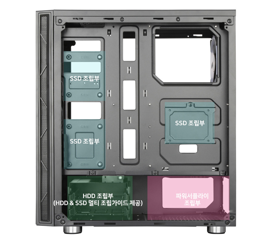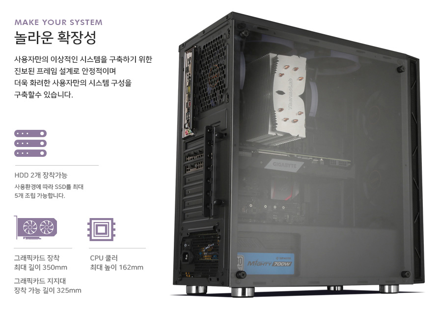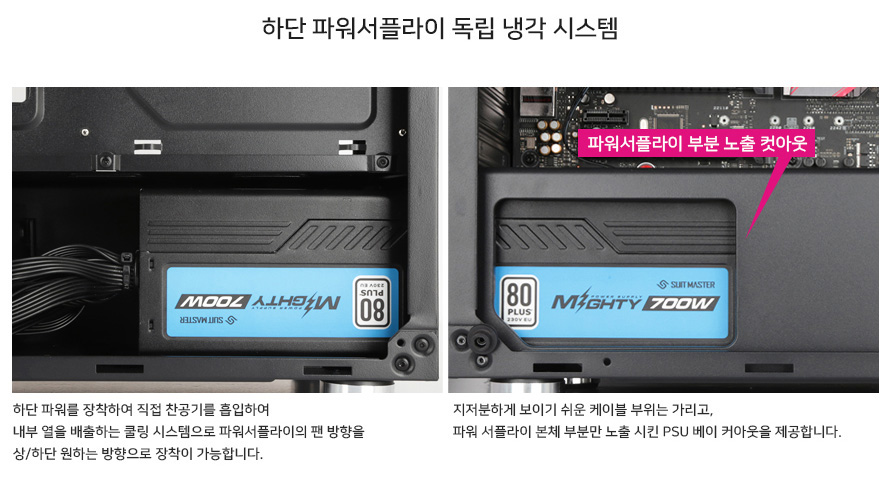 파워 서플라이 전용공간으로 쿨링 성능이 향상되는 시스템입니다.