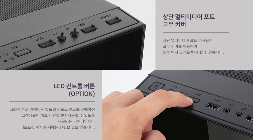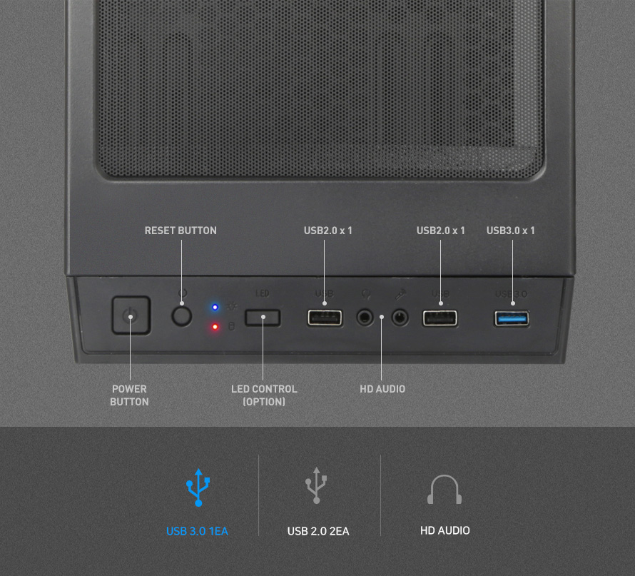 파워 버튼, RESET 버튼, Power & Hdd LED, LED Control(Option), USB 2.0 단자 1개, 마이크 & 이어폰 단자, USB 2.0 단자 1개, USB 3.0 단자 1개