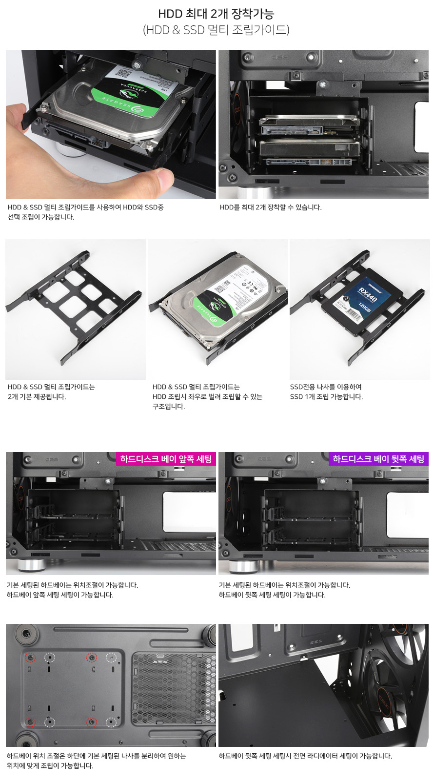가이드에 하드디스크를 제공하는 전용 나사로 결합하는 방식입니다. HDD 는 나사 없이 장착이 가능합니다.