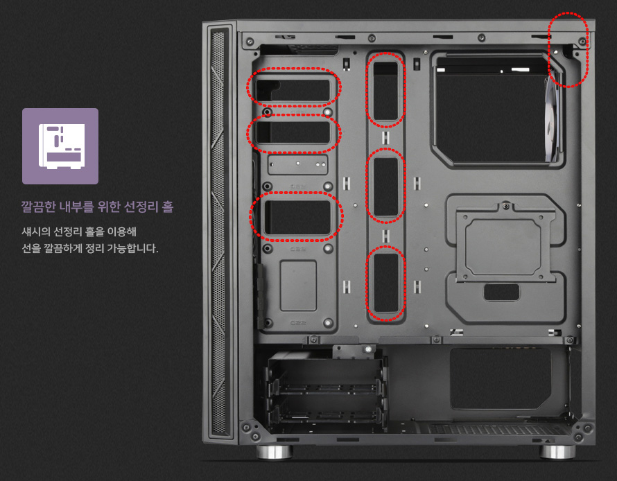 깔끔한 내부를 위한 선 정리 홀이 7개나 이어 선 정리를 깔끔하게 처리할 수 있습니다.