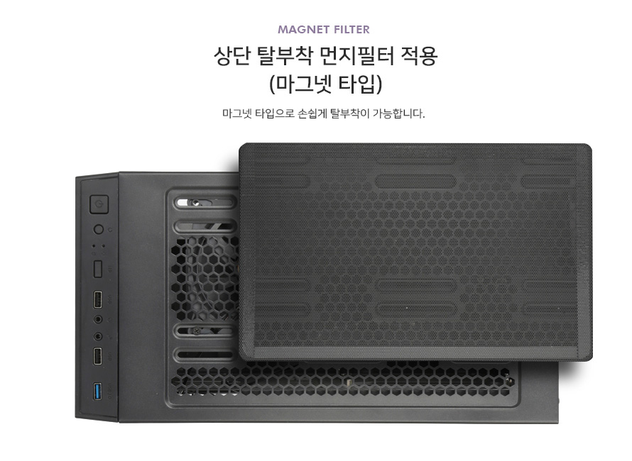 상단부분에는 내외부로 공기를 배출하거나 유입할 수 있도록 타공된 디자인이며 먼지 필터는 자석으로 탈부착이 되기 때문에 간단하게 탈착 후 청소가 가능하여 사용자에게 편리성을 제공합니다.