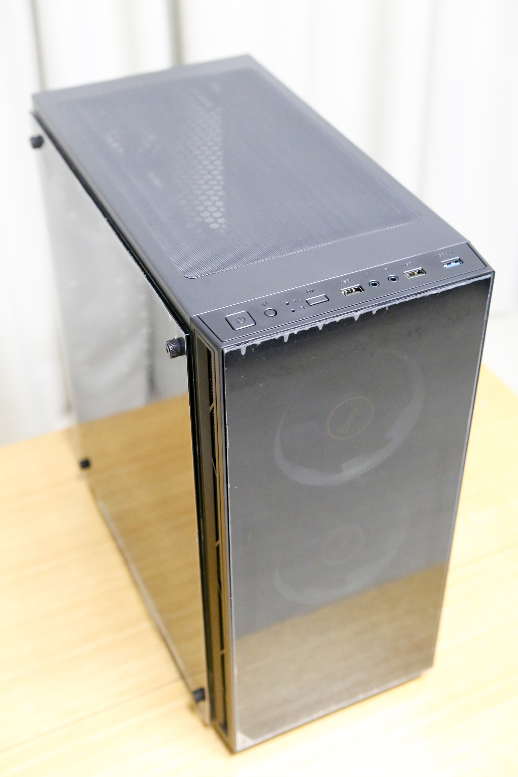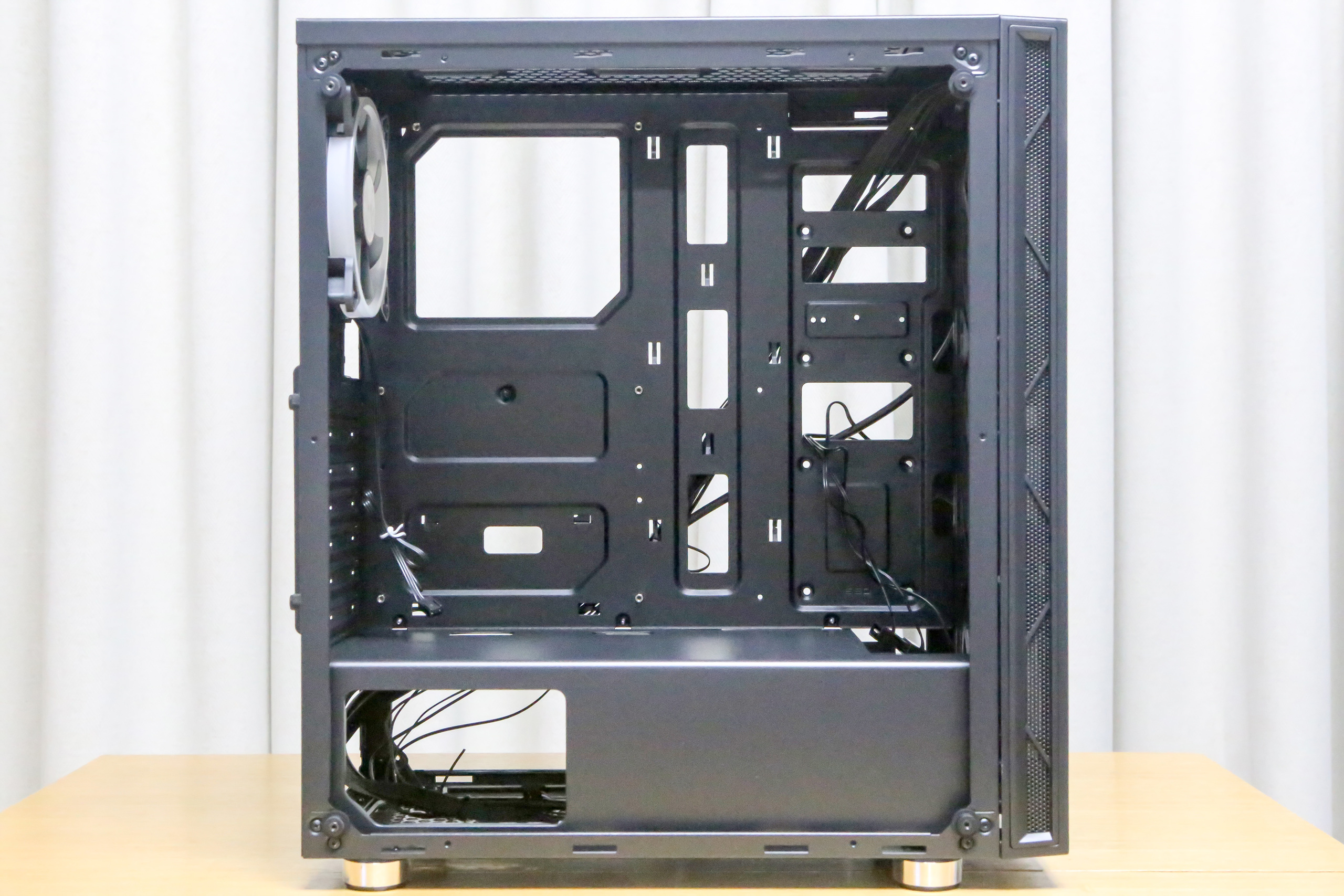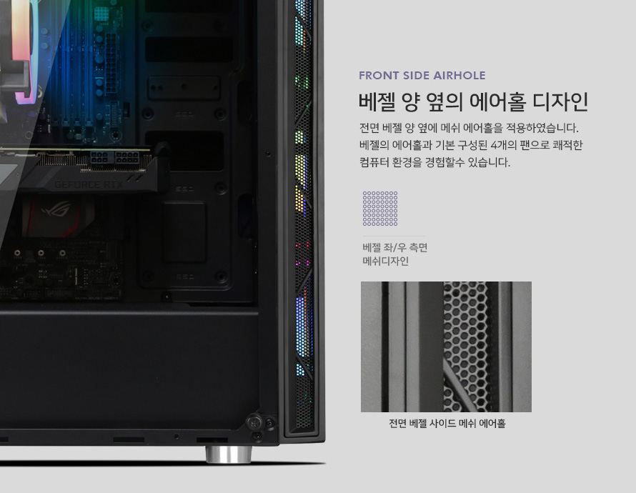 전면 베젤의 양옆의 메쉬 에어홀을 적용하여 1차로 먼지를 걸러주며 전면의 기본 3개의 팬으로 시원한 공기를 유입시켜 쾌적한 컴퓨터 환경을 경험할 수 있습니다.