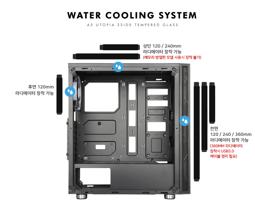 전면 120mm / 240mm / 360mm (360mm 사용 시 USB 3.0 케이블 정리 필요함)