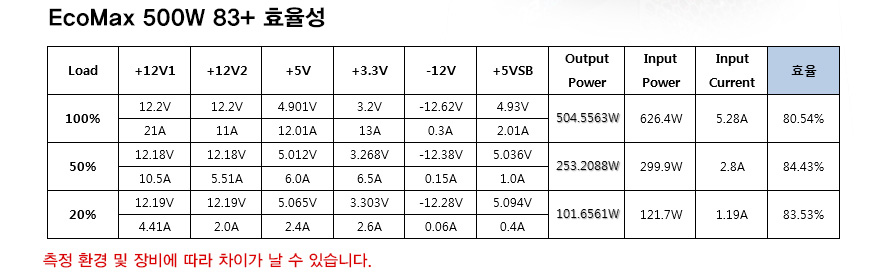 컴퓨터 전원 공급 장치 (PSU)의 에너지 효율을 평가하는 국제 규격인 CLEAResult의 80 PLUS® 미인증 제품이지만, 자체 테스트 결과 100% 로드 시 80.54% 효율이며, 실사용 영역 구간인 50% 로드시 최대 84.43%가 측정된 것을 표에서 확인할 수 있습니다.