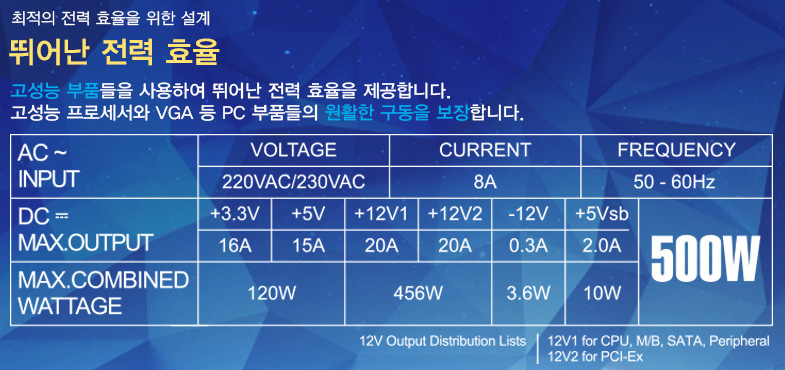+12VDC로 듀얼 레일 출력으로 고성능 고효율을 자랑하고 있습니다.