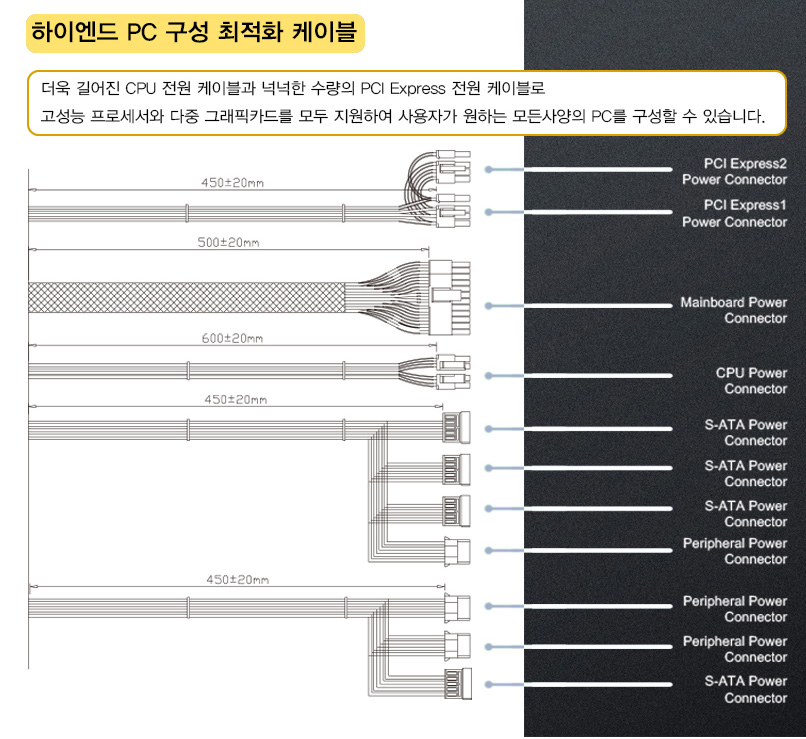 슬리빙 처리된 메인보드에 전원을 공급하는 20+4핀 ATX 주전원 케이블 1개,