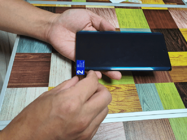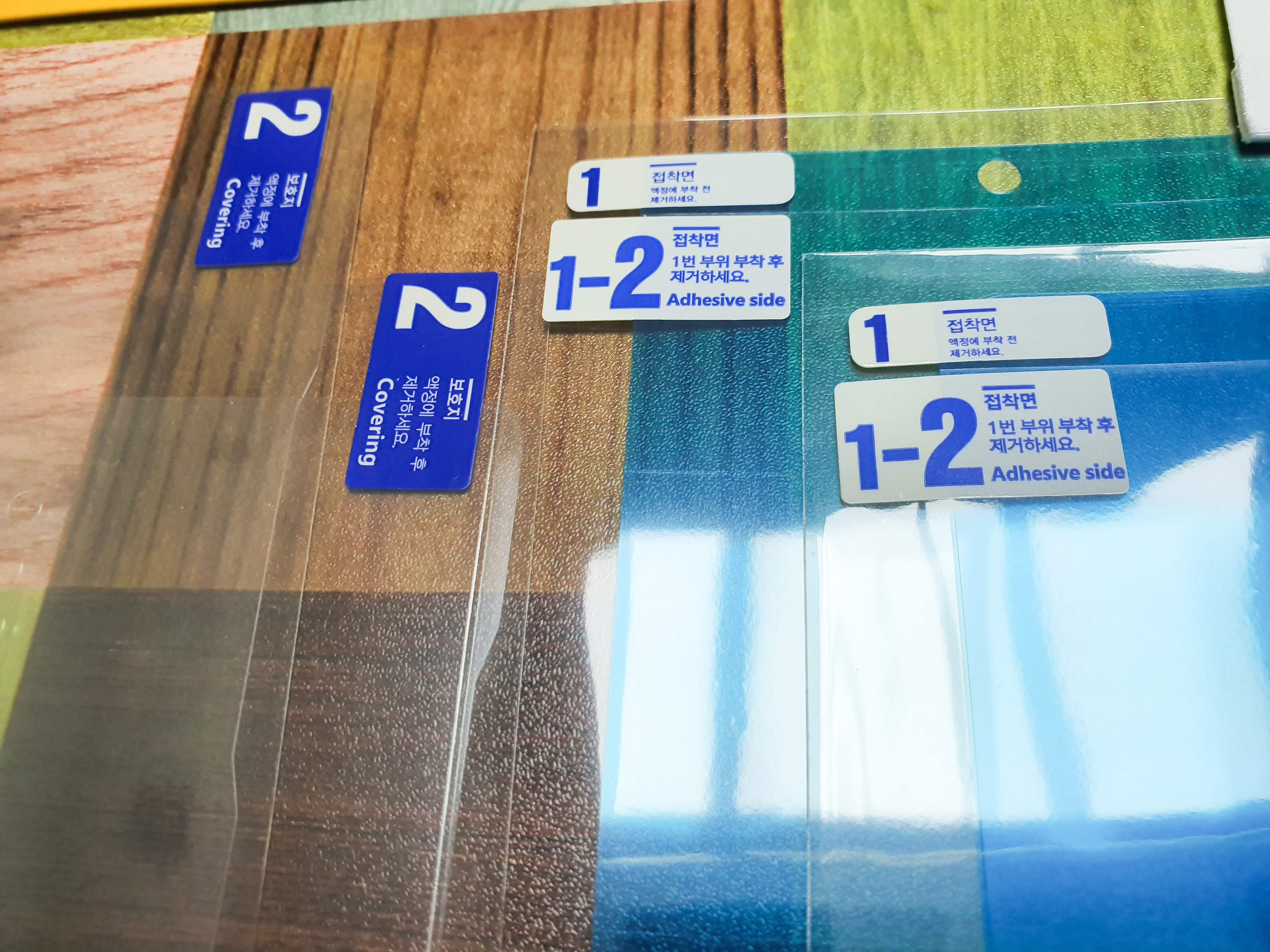 이제 순서대로 1번을 제거하고 스마트폰과 위치를 잘 맞춰서 수평, 수직을 잘 확인하여 붙이고 나머지 1-2를 붙여주면 됩니다.