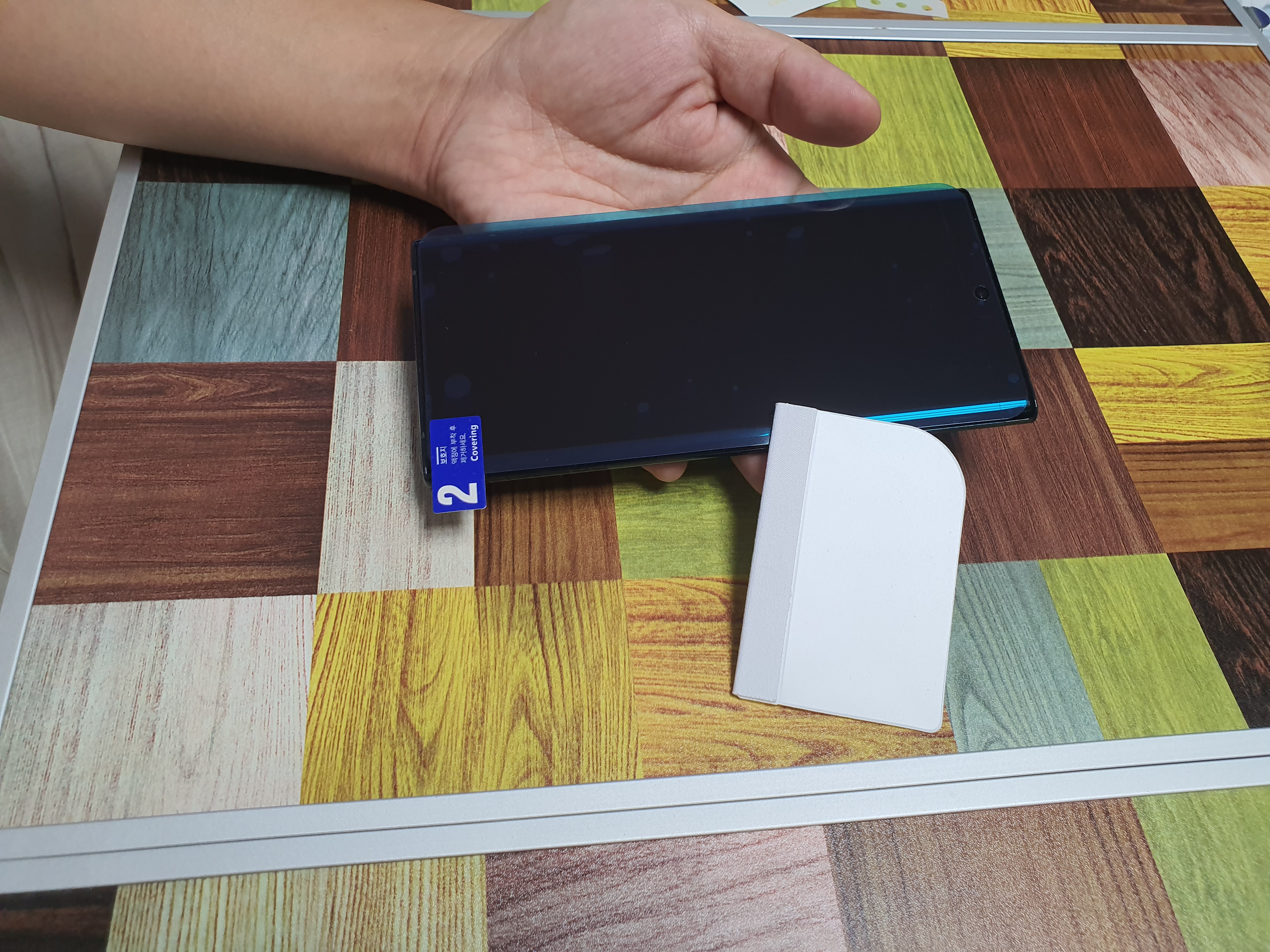기포가 제거되면 이제 2번을 제거해주고 엣지부분까지 손으로 잘 마감하며 붙여주면 끝!!