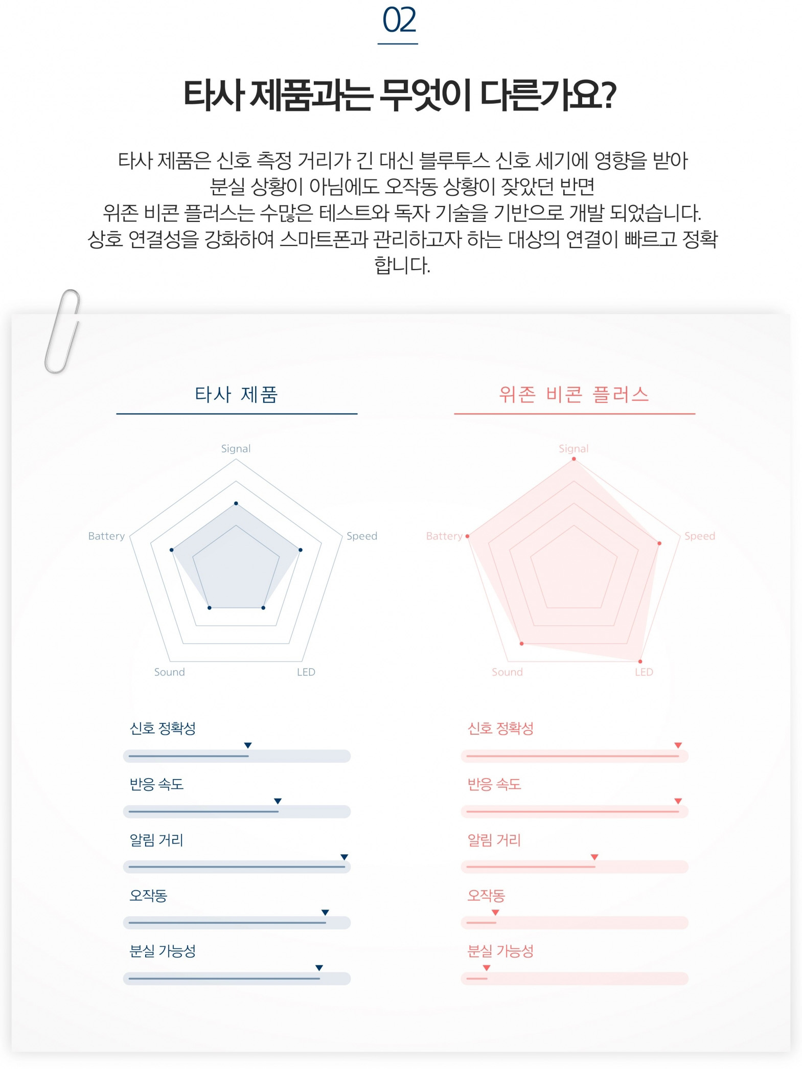 타사 제품은 신호 측정 거리가 긴 대신 블루투스 신호 세기에 영향을 받아 분실 상황이 아님에도 오작동 상황이 잦았던 반면에 위존 비콘 플러스는 수많은 테스트와 독자 기술을 기반으로 개발되어 상호 연결성을 강화하여 스마트폰과 관리하고자 하는 대상의 연결이 빠르고 정확하다고 합니다.