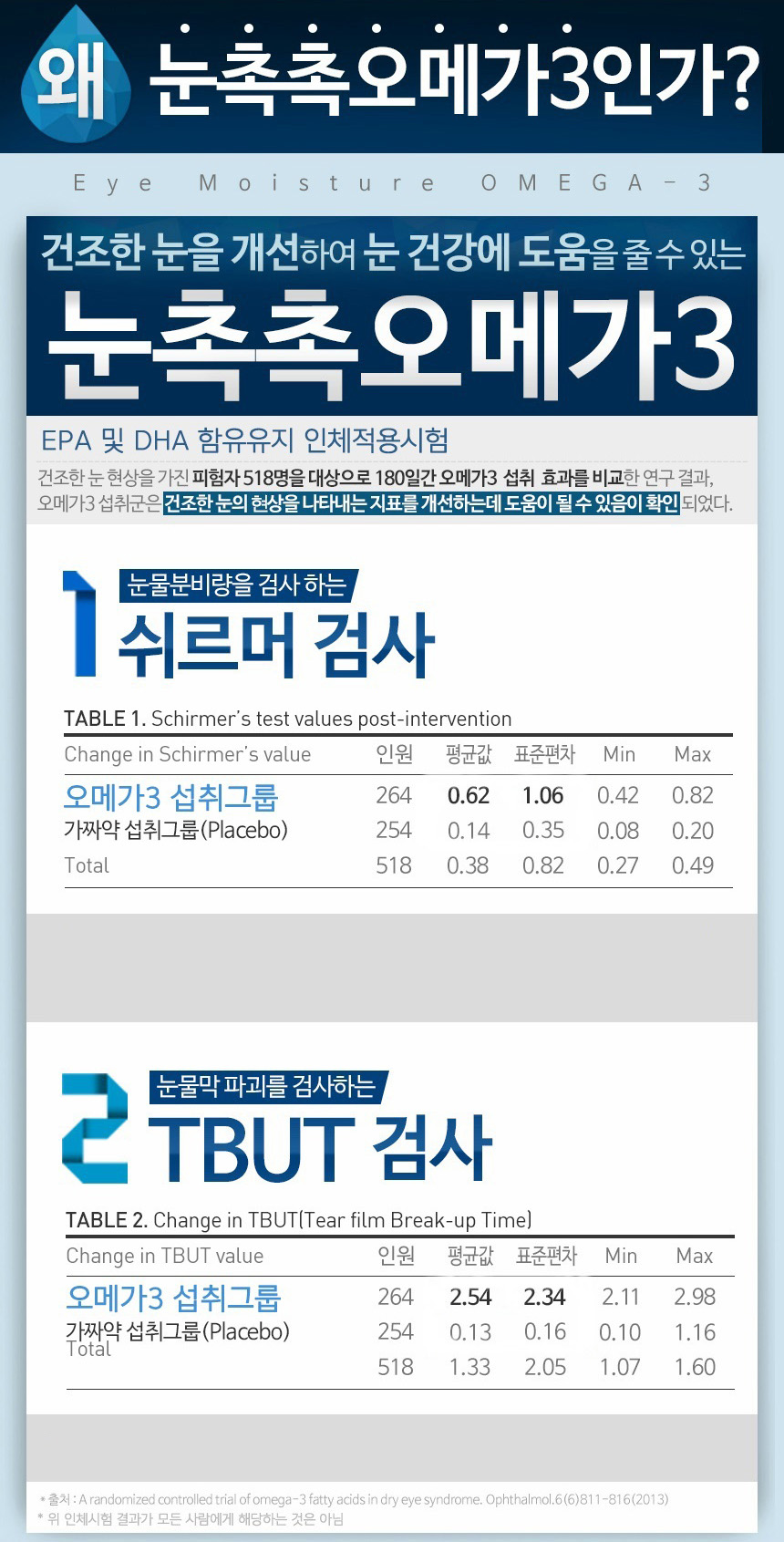 건조한 눈 현상을 가진 피험자 518명을 대상으로 180일간 오메가3 섭취 효과를 비교한 연구하였으며, 눈물 분비량을 검사하는 쉬르머 (Schirmer's) 검사 및 눈물막 파괴를 검사하는 TBUT (Tear film Break-up Time) 검사를 하였다고 합니다.
