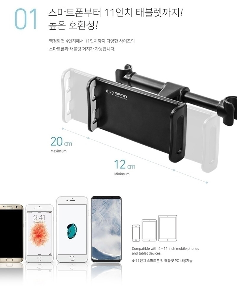 아이패드, 갤럭시탭, 아이폰, 갤럭시 S, 갤럭시노트 등의 12cm ~ 20cm의 스마트 기기들을 사용 할 수 있습니다.