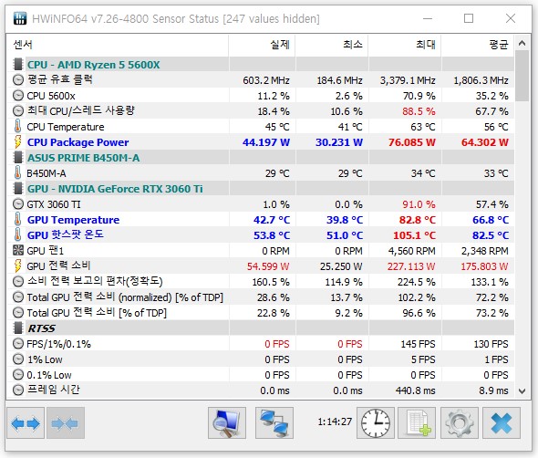 QHD 모니터에서 평균 프레임은 130FPS 정도였고, CPU 최대 88.5% 가동 온도는 최대 63도까지 올라갔고, 평균은 56도입니다.